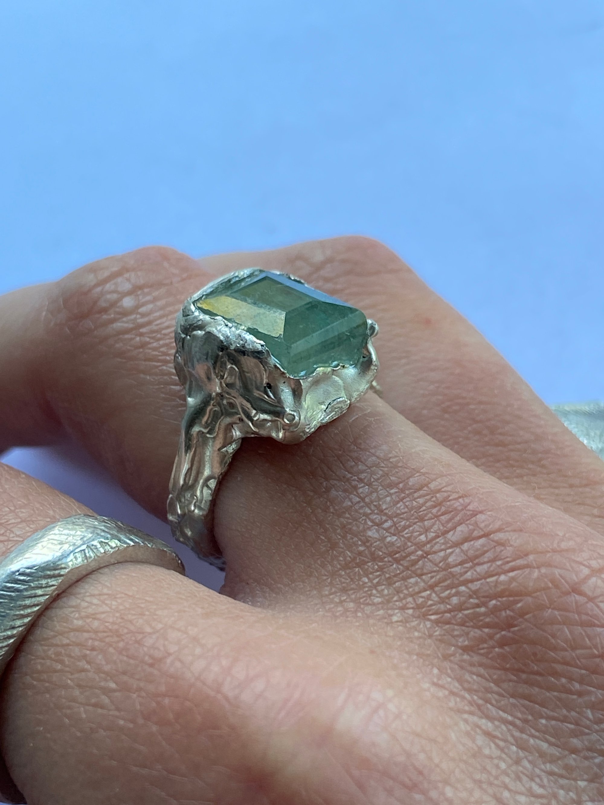 Our made-to-order Siggy 27, handcrafted with an aquamarine gemstone and casted in recycled sterling silver.