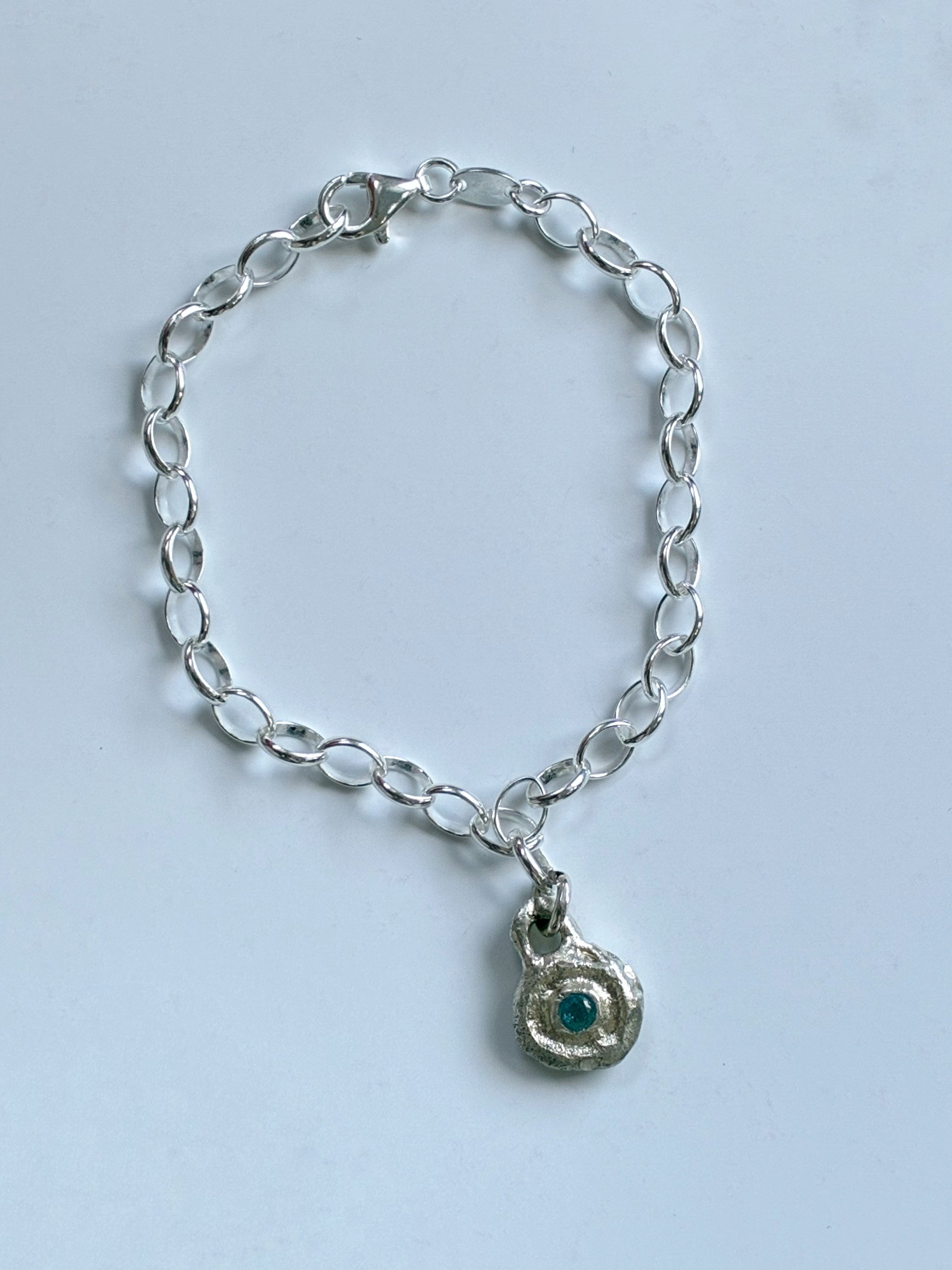 Our made-to-order Siggy Evil Eye Bracelet, casted in recycled sterling silver.